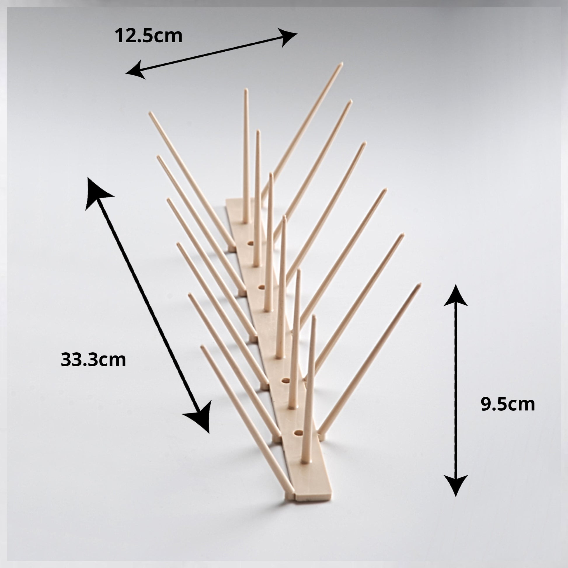 - Apply a thin line of quality glue to the bird spike base and press down onto the surface or use the convenient holes for fasteners or screws.